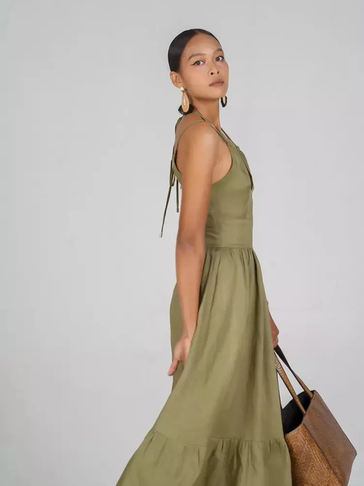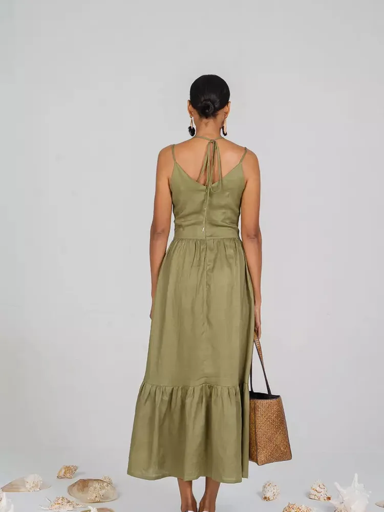 تفاصيل فستان كتان كاجوال طويل بياقة V عميقة للسيدات